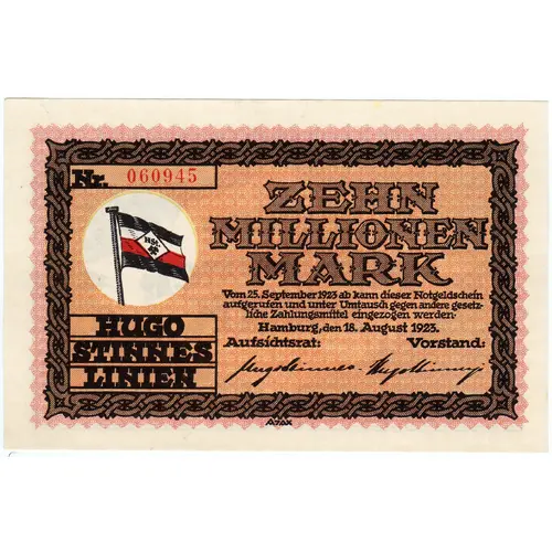 | Obverse lettering | ZEHN MILLIONEN MARK Vom 25, September 1923 ab kann dieser Notgeldschein aufgerufen und unter Umtausch gegen andere gesetzliche Zahlungsmittel eingezogen werden. Hamburg, den 18. August 1923 HUGO STINNES LINIEN Aufsichtsrat: (signature) Vorstand: (signature) (Translation: TEN MILLION MARK This emergency note can be used from September 25, 1923 called and exchanged for other legal Means of payment are withdrawn. Hamburg, August 18, 1923 HUGO STINNES LINES Supervisory Board: (signature) Management Board: (signature)) |
