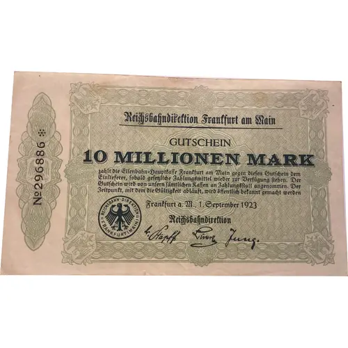 | Obverse lettering | Reichsbahndirektion Frankfurt am Main Gutschein 10 MILLIONEN MARK zahlt die Eisenbahn=Hauptkasse Frankfurt am Main gegen diesen Gutschein dem Einlieferer,Sobald gesetzliche Zahlungsmittel wieder zur Berfugung Stehen.Der Gutschein wird von unsern Sämtlichen Kassen an Zahlungsstatt angenommen.Der Zeitpunkt,mit dem die Gültigkeit abläuft,wird öffentlich bekannt gemacht werden Frankfurt a.M.,1.September 1923 Reichsbahndirektion |