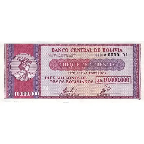 | نوشتههای روی اسکناس | BANCO CENTRAL DE BOLIVIA DECRETO SUPREMO NO. 20732 DE 8 DE MARZO DE 1985 CHEQUE DE GERENCIA PAGUESE AL PORTADOR DIEZ MILLONES DE PESOS BOLIVIANOS $b. 10.000.000 $b 10.000.000 (Translation: Central Bank of Bolivia Supreme Decree # 20732 of March 8th., 1985 Management Check Be paid to the bearer Ten Million Pesos Bolivianos $b. 10,000,000.00 $b. 10,000,000.00) |