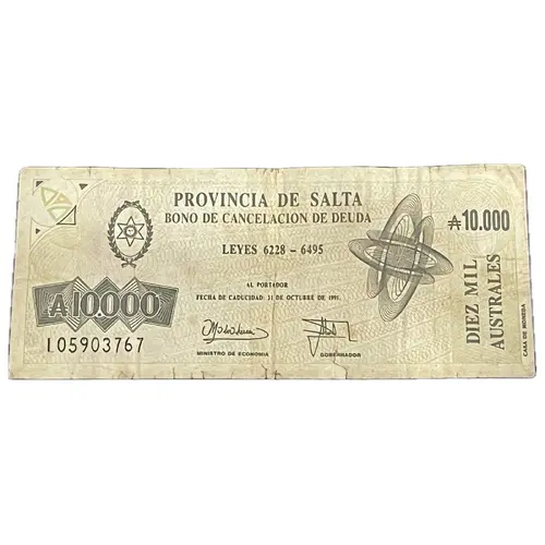 PROVINCIA DE SALTA ₳10000 BONO DE CANCELACION DE DEUDA LEYES 6228 - 6495 AL PORTADOR FECHA DE CADUCIDAD: 31 DE OCTUBRE DE 1991 ₳10000 DIEZ MIL AUSTRALES (vertical on right) (Translation: Province of Salta Debt cancellation bond Laws 6228-6495 To the bearer Expiry date Oct. 31, 1991 Ten thousand Australes) |