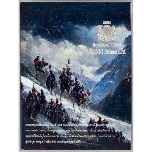 | Obverse lettering | 2024 Republique Du Tchad 10000 Francs CFA Bonaparte franchissant le Grand-Saint-Bernard est un portrait amestre de Napoleon Bonaparte alors Premier Consul, realise par Jacques-Louis David entre 1800 et 1803. Napoleon est represente lors du francbissement du col alpin du Grand-Saint-Bernard par larmee de reserve, episode qui marque le debut de la seconde campagne d`italie. (Translation: Republic of Chad Bonaparte crossing the Great Saint-Bernard is an amestre portrait of Napoleon Bonaparte then First Consul, produced by Jacques-Louis David between 1800 and 1803. Napoleon is represented during the crossing of the Great Saint-Bernard Alpine pass by the reserve army, an episode which marks the beginning of the second Italian campaign.) |
