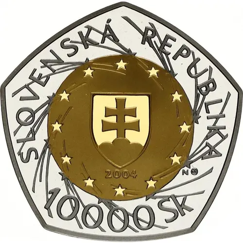 | Obverse description | The state shield of Slovak Republic, the year 2004, together with the circle of twelve stars - the symbol of the European Union - are depicted on a round golden blank located in the middle of the obverse of the coin On the division of metals the is another circle of ten stars representing the accession countries. The name of the state SLOVENSKA REPUBLIKA is inscribed near the top edge of the coin on the palladium blank. The nominal value of Sk 10,000 is located near the bottom edge. The initial of the name of the designer Stefan Novotny, and the Kremnica Mint mark are located on the line with the year of issue on the right near the division of metals. |