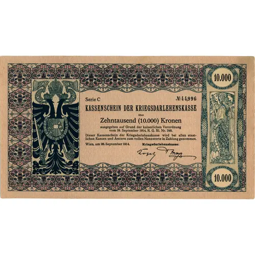 | Obverse lettering | 10.000 KASSENSCHEIN DER KRIEGSDARLEHENSKASSE über Zehntausend (10.000) Kronen |