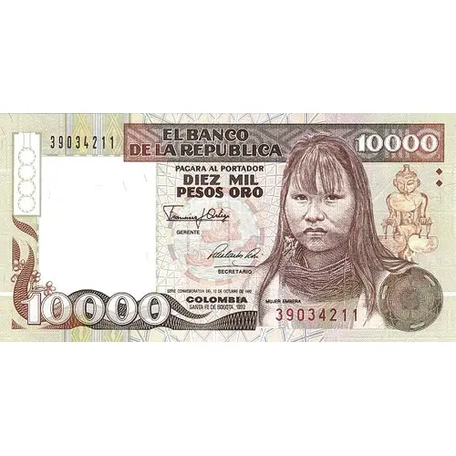 | Obverse lettering | EL BANCO DE LA REPUBLICA PAGARA AL PORTADOR DIEZ MIL PESOS ORO SERIE CONMEMORATIVA DEL 12 DE OCTUBRE DE 1492 COLOMBIA MUJER EMBERA SANTA FE DE BOGOTA, 1992 (Translation: The Bank of the Republic (Central Bank) will pay the bearer Ten thousand gold pesos Commemorative series of the 12th October 1492 Colombia Embera woman Santa Fe de Bogota, 1992) |