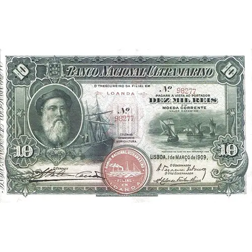BANCO NACIONAL ULTRAMARINO O THESOUREIRO DA FILIAL EM LOANDA PAGARÁ Á VISTA AO PORTADOR DEZ MIL REIS EM MOEDA CORRENTE VALOR RECEBIDO (Translation: National Overseas Bank, The Branch Treasurer in Luanda, Will pay the holder on sight ten thousand réis in current currency) |