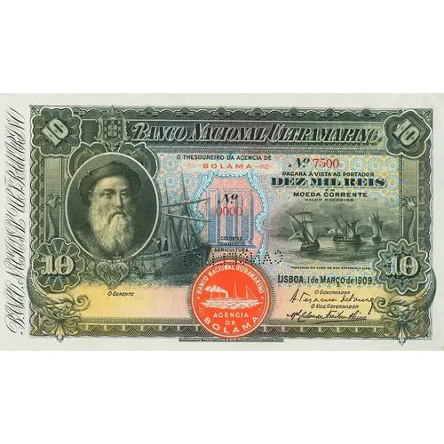 | Obverse lettering | BANCO NACIONAL ULTRAMARINO O THESOUREIRO DA AGENCIA DE BOLAMA PAGARA A VISTA A PORTADOR DEZ MIL REIS EM MOEDA CORRENTE VALOR RECIBIDO LISBOA, I DE MARÇO DE 1909. (Translation: National Bank Overseas the Treasurer of the Agency of Bolama pay to the bearer Ten Thousand Reis in currency amount received Lisbon, March 1, 1909.) |