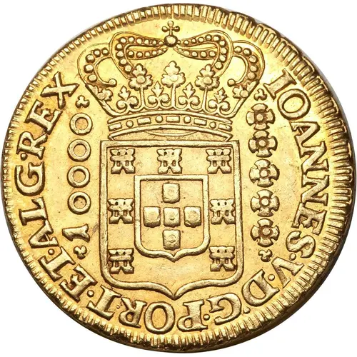 | Obverse lettering | IOANNES·V·D·G·PORT·ET·ALG·REX 10000 (Translation: IOANNES QUINTUS DEI GRATIA PORTUGALIÆ ET ALGARBIORUM REX João V, by the Grace of God, King of Portugal and Algarves.) |