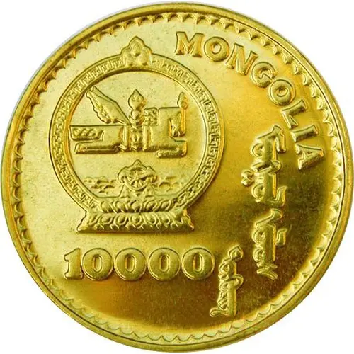 | نوشتههای روی سکه | MONGOLIA ᠮᠤᠩᠭᠤᠯ ᠤᠯᠤᠰ 10000 ᠲᠥᠭᠦᠷᠢᠭ᠌ (Translation: Monggol Ulus (Mongolia) 10000 Togrog) |