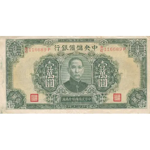 | Obverse lettering | 行銀備儲央中 圓萬壹 圓萬壹幣國國民華中 印年三十三國民華中 |