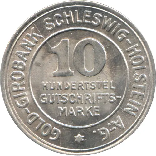 | Obverse lettering | GOLD-GIROBANK SCHLESWIG-HOLSTEIN A.-G. 10 HUNDERTSTEL GUTSCHRIFTS- MARKE ✶ |