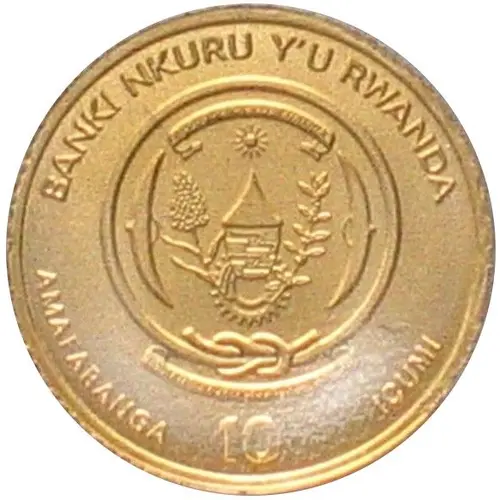 | Obverse lettering | BANKI NKURU Y`U RWANDA REPUBLIKA Y`U RWANDA UBUMWI - UMURIMO - GUKUNDA IGIHUGU AMAFARANGA 10 ICUMI (Translation: Central Bank of Rwanda. Republic of Rwanda. Unity, work, patriotism. Ten francs.) |