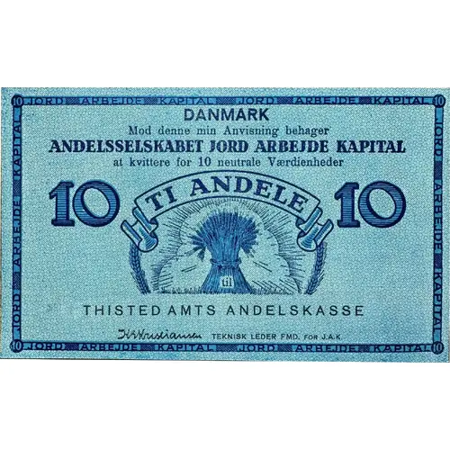 | Obverse description | The note features the denomination `10` on both the left and right sides. At the top, the word `DANMARK` is prominently displayed. Below it, there is the name of the issuing society `Andelsselskabet Jord-Arbejde-Kapital` along with a text block. In the center, there is an image of a sheaf of wheat with the text `TI ANDELE` (Ten Shares) around it. The bottom of the note displays `THISTED AMTS ANDELSKASSE` and a signature. The border is decorated with the repeated phrase `JORD ARBEJDE KAPITAL.` The color scheme is predominantly blue. |