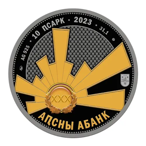 | Aversbeschreibung | The obverse of the coin in the central field depicts a gilded symbol of the 30th anniversary of the Victory in the Patriotic War of the People of Abkhazia 1992-1993, which is a diagram of the losses of the armed forces of Abkhazia during the period of hostilities. The circular legend in the Abkhaz language indicates: the denomination of 10 apsars, the name of the issuer `A ҧsny Abank`, the date 2023, the sample and weight of the metal, the mint mark MMD. In the right part of the field is the state emblem of the Republic. |