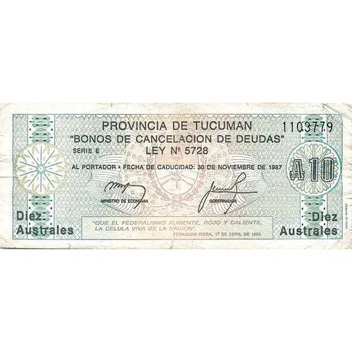 PROVINCIA DE TUCUMAN `BONOS DE CANCELACION DE DEUDAS` SERIE E LEY N° 5728 AL PORTADOR FECHA DE CADUCIDAD 30 DE NOVIEMBRE DE 1987 `QUE EL FEDERALISMO ALIMENTE, ROJO Y CALIENTE, LA CELULA VIVA DE LA NACIÓN` FERNANDO RIERA, 1° DE ABRIL DE 1985 (Translation: PROVINCE OF TUCUMAN `DEBT CANCELLATION BONDS` SERIE E LAW N ° 5728 THE BEARER EXPIRATION DATE NOVEMBER 30, 1991 `LET FEDERALISM FEED, RED AND HOT, THE LIVING CELL OF THE NATION ` FERNANDO RIERA, APRIL 1, 1985) |