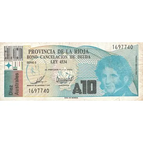 PROVINCIA DE LA RIOJA BONO CANCELACION DE DEUDA LEY 4534 AL PORTADOR Y A LA VISTA Diez Australes (Translation: La Rioja Province Debt Cancellation Bond Law 4534 To the bearer in sight Ten austral) |