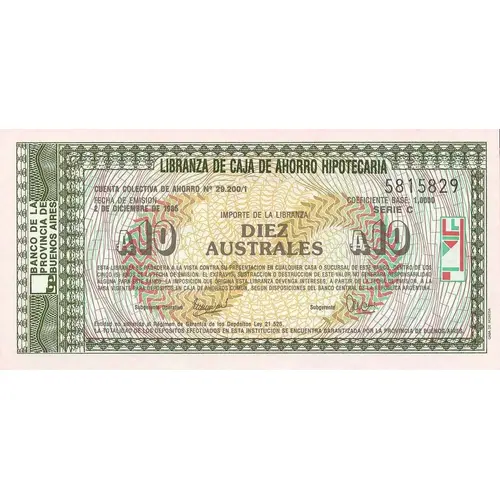 Legenda del dritto BANCO DE LA PROVINCIA DE BUENOS AIRES LIBRANZA DE CAJA DE AHORROHIPOTECARIA CUENTA COLECTIVA DE AHORRO N° 29.200/1 FECHA DE EMISION 2 DE DICIEMBRE DE 1985 COEFICIENTE BASE: 1,0000 SERIE C IMPORTE DE LA LIBRANZA ₳10 DIEZ AUSTRALES ESTA LIBRANZA ES PAGADERA A LA VISTA CONTRA SU PRESENTACION EN CUALQUIER CASA O SUCURSAL DE ESTE BANCO, DENTRO DE LOS CINCO (5) AÑOS DE LA FECHA DE EMISION. EL EXTRAVIO, SUSTRACCION O DESTRUCCION DE ESTE VALOR NO GENERARA RESPONSABILIDAD ALGUNA PARA ESTE BANCO. LA IMPOSICION QUE ORIGINA ESTA LIBRANZA DEVENGA INTERESES, A PARTIR DE LA FECHA DE EMISIÓN, A LA TASA VIGENTE PARA DEPOSITOS EN LA CAJA DE AHORRO COMUN, SEGÚN DISPOSICIONES DEL BANCO CENTRAL DE LA REPUBLICA ARGENTINA. Entidad no adherida al Régimen de Garantía de los Depósitos Ley 21.526 LA TOTALIDAD DE LOS DEPOSITOS EN ESTA INSTITUCION SE ENCUENTRA GARANTIZADA POR LA PROVINCIA DE BUENOS AIRES. CASA DE MONEDA