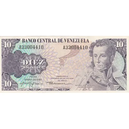 | Obverse description | Design in violet. On the right, portrait of Antonio José de Sucre from Arturo Michelena. On the left, the denomination in words `DIEZ BOLIVARES` «Ten Bolívares». In each corner but bottom right corner, the denomination value `10`. On the top, the issuer name `BANCO CENTRAL DE VENEZUELA` «Central Bank of Venezuela». On the bottom, the payment clause `PAGADEROS AL PORTADOR EN LAS OFICINAS DEL BANCO` «Payments to the Bearier in the Offices of the Bank» |