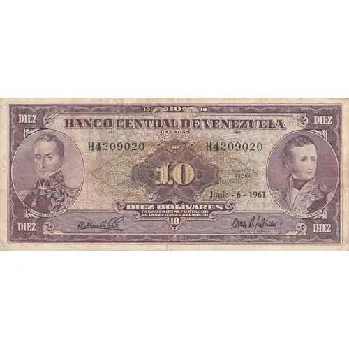 Design in violet with frame-like border. On the left, portrait of Simon Bolivar inside an oval from unknown author. On the right, inside an oval, portrait taken from the litography of Lemoine about the Marshal of Ayacucho, Antonio José de Sucre. In each corner the value in words `DIEZ` «ten». In the center, the denomination value `10`, below the denomination in words `DIEZ BOLIVARES` «Ten Bolívares» and the payment clause `PAGADEROS AL PORTADOR EN LAS OFICINAS DEL BANCO` «Payments to the Bearier in the Offices of the Bank». On the top, the issuer name `BANCO CENTRAL DE VENEZUELA` «Central Bank of Venezuela». |