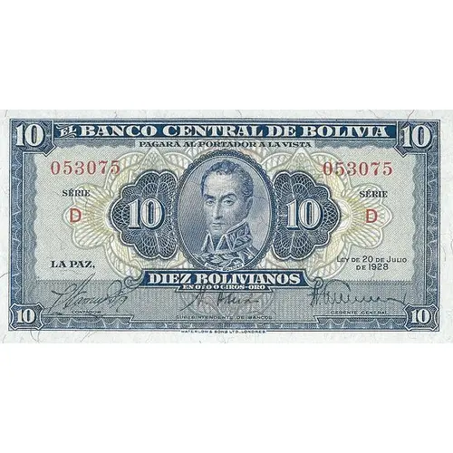 | Légende de l’avers | El Banco Central de Bolivia La Paz, Ley de 20 de Julio de 1928. Pagará al portador a la vista Diez Bolivianos en oro o giros - oro (Translation: The Central Bank of Bolivia La Paz, Law of July 20, 1928. Will pay the bearer on demand 10 Bolivianos in gold or money - gold) |