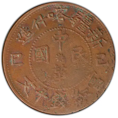 造什喀疆新 巳己 中 國民 華 文十錢紅當 (Translation: Made in Kashgar, Sinkiang Year 6 Republic of China Each piece worth 10 Cash) |