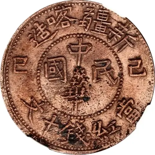 | Obverse lettering | 造喀疆新 巳己 中 國民 華 文十錢紅當 (Translation: Made in Kashgar, Sinkiang Year 6 Republic of China Each piece worth 10 Cash) |
