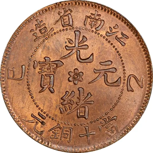 | Opschrift voorzijde | 造省南江 巳乙 光 寶 元 緒 元銅十當 (Translation: Made in Kiangnan Province Year 42 Guangxu (Emperor) / Yuanbao (Original currency) Worth 10 copper currency) |