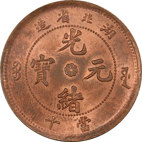 造省北湖 ᠪᠣᠣ ᠶᡠᠸᠠᠨ 光 寶元 緒 十當 (Translation: Made in Hupeh Province Yuanbao (Original currency) Guangxu (Emperor) / Yuanbao (Original currency) Worth 10 Cash) |