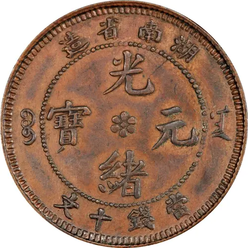 造省南湖 ᠪᠣᠣ ᠨᠠᠨ 光 寶 元 緒 文十錢當 (Translation: Made in Hunan Province Boo-nan (Hunan Mint) Guangxu (Emperor) / Yuanbao (Original currency) Worth 10 Cash currency) |
