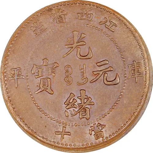 造省西江 平厙 光 寶 ᠪᠣᠣ ᠴᠠᠩ 元 緒 十當 (Translation: Made in Kiangsi Province Ku-Ping Guangxu (Emperor) / Yuanbao (Original currency) Boo-chang (mint) Worth 10 (Cash)) |