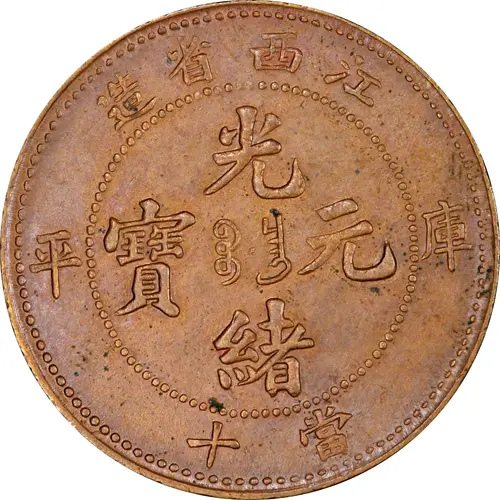 造省西江 平厙 光 寶 ᠪᠣᠣ ᠴᠠᠩ 元 緒 十當 (Translation: Made in Kiangsi Province Ku-Ping Guangxu (Emperor) / Yuanbao (Original currency) Boo-chang (mint) Worth 10 (Cash)) |