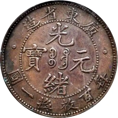造省東廣 光 寶 ᠪᠣᠣ ᡤᡠᠸᠠᠩ 元 緒 圓一换枚百每 (Translation: Made in Kwangtung Province Guangxu (Emperor) / Yuanbao (Original currency) Boo-guwang (mint) 100 pieces in every Yuan) |