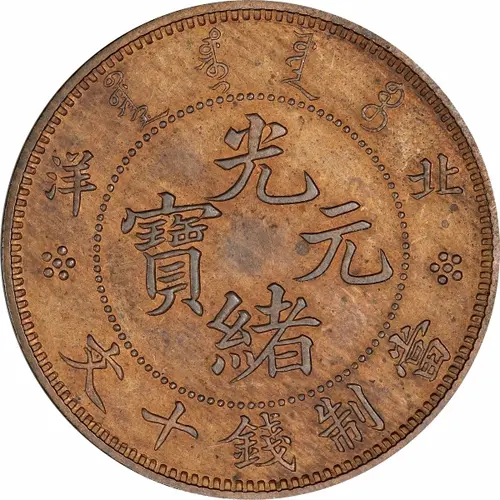 ᠪᠠᡩᠠᠷᠠᠩᡤᠠ ᡩᠣᠷᠣ ᡳ᠋ ᠶᡠᠸᠠᠨ ᠪᠣᠣ 洋北 光 寶元 緒 文十錢制當 (Translation: Guangxu (Emperor) / Yuanbao (Original currency) Pei Yang Guangxu (Emperor) / Yuanbao (Original currency) 10 Cash currency) |