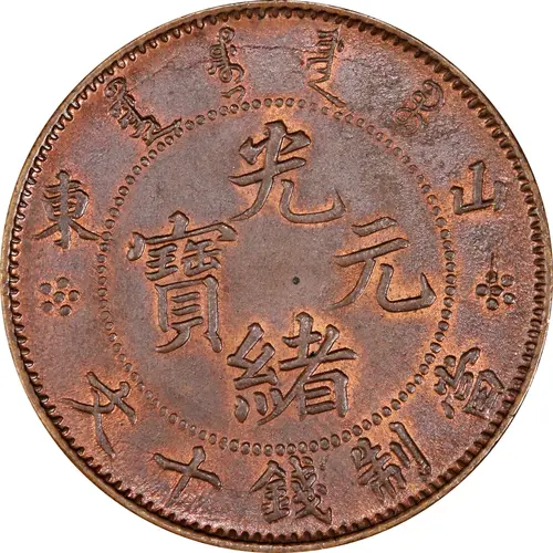 ᠪᠠᡩᠠᡵᠠᠩᡤᠠ ᡩᠣᡵᠣ ᠶᡠᠸᠠᠨ ᠪᠣᠣ 東山 光 寶元 緒 文十錢制當 (Translation: Guangxu (Emperor) / Yuanbao (Original currency) Shantung Guangxu (Emperor) / Yuanbao (Original currency) Worth 10 Cash currency) |
