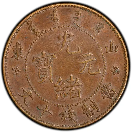 造省東山 光 寶元 緒 文十錢制當元每 (Translation: Made in Shantung Guangxu (Emperor) / Yuanbao (Original currency) Worth 10 Cash currency in Yuan) |