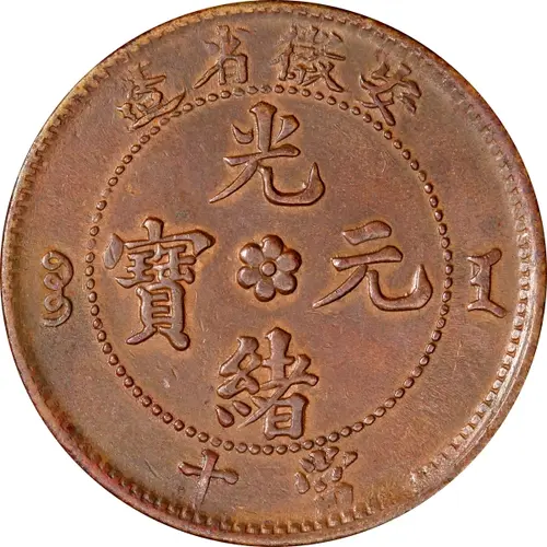 造省徽安 ᠪᠣᠣ ᠠᠨ 光 寶元 緒 十當 (Translation: Made in Anhwei Province Boo-an (An-hwei Mint) Guangxu (Emperor) / Yuanbao (Original currency) 10 Cash) |