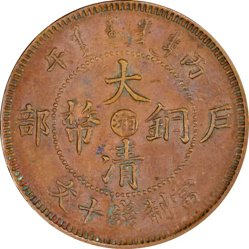 | Reverse lettering | 造年緒光 TAI-CHING-TI-KUO COPPER COIN (Translation: Made in the reign of Guangxu (Emperor) Copper coin of the Great Qing Empire) |
