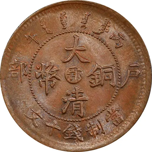 | Obverse lettering | 午 ᠪᠠᡩᠠᠷᠠᠩᡤᠠ ᡩᠣᠷᠣ ᡳ ᠠᠨᡳᠶᠠᡳ ᠸᡝᡳᠯᡝᡥᡝ 丙 部戶 大 幣鄂銅 清 文十錢制當 (Translation: Guangxu (Emperor) / Made in the Year 43 Ministry of Revenue (minting authority) Great Qing`s copper currency / Hupeh (mint) Currency worth 10 Cash (Wen)) |