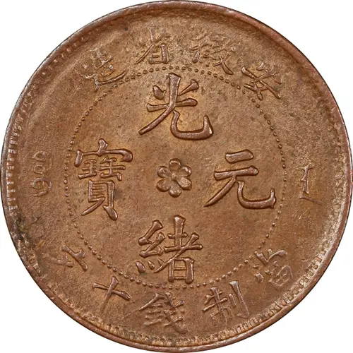造省徽安 ᠪᠣᠣ ᠠᠨ 光 寶元 緒 文十錢制當 (Translation: Made in Anhwei Province Boo-an (An-hwei Mint) Guangxu (Emperor) / Yuanbao (Original currency) 10 Cash currency) |