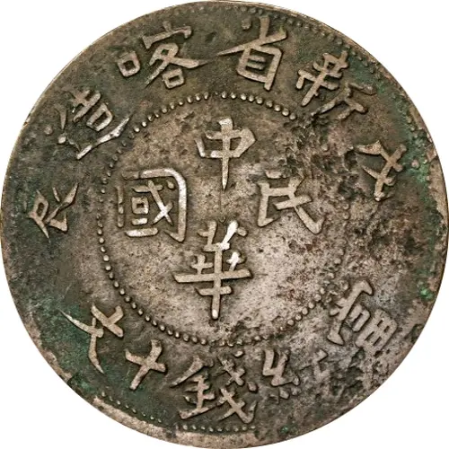 | Obverse lettering | 造喀省新 辰戊 中 國民 華 文十錢紅當 (Translation: Made in Kashgar, Sinkiang Province Year 5 Republic of China Each piece worth 10 Cash) |