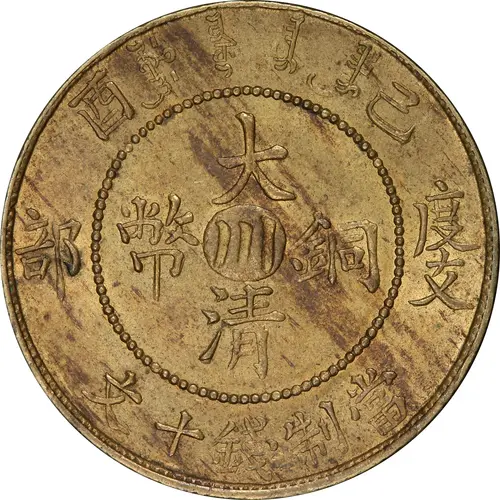 酉 ᡤᡝᡥᡠᠩᡤᡝ ᠶᠣᠰᠣ ᡳ ᠠᠨᡳᠶᠠᡳ ᠸᡝᡳᠯᡝᡥᡝ 己 部度支 大 幣川銅 清 文十錢制當 (Translation: Xuantong (Emperor) / Made in the Year 46 Ministry of Revenue (minting authority) Great Qing`s copper currency / Szechuan (mint) Currency worth 10 Cash (Wen)) |