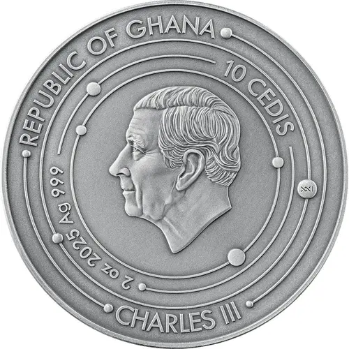 | Obverse lettering | REPUBLIC OF GHANA 10 CEDIS XXI 2 oz 2025 Ag 999 CHARLES III |
