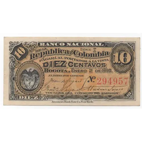 | Legenda del dritto | Banco Nacional Republica de Colombia Pagara Al Portador A La Vista Diez Centavos |