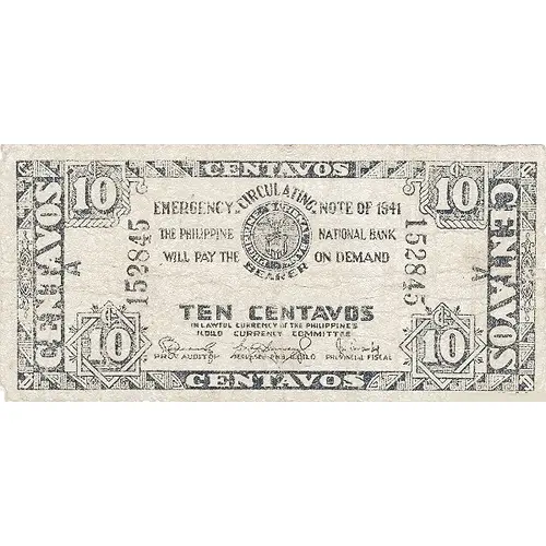 EMERGENCY CIRCULATING NOTE OF 1941 THE PHILIPPINE NATIONAL BANK WILL PAY THE BEARER ON DEMAND TEN CENTAVOS IN LAWFUL CURRENCY OF THE PHILIPPINES ILOILO CURRENCY COMMITTEE |