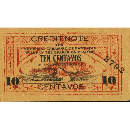 | Obverse lettering | CREDIT NOTE THE MUNICIPAL TREASURY OF BANTAYAN WILL PAY THE BEARER ON DEMAND TEN CENTAVOS IN LAWFUL CURRENCY 10 CENTAVOS 10 |