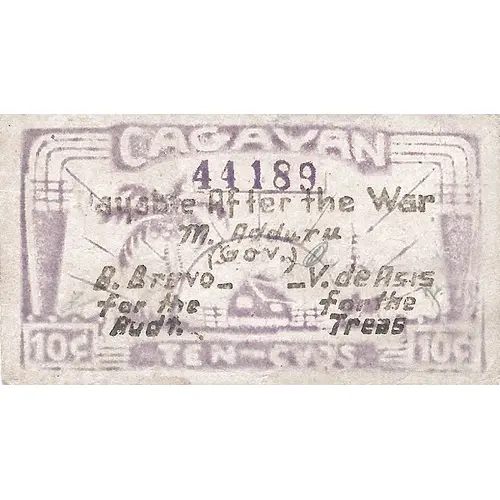 | Obverse lettering | CAGAYAN PAYABLE AFTER THE WAR TEN CVOS 10 ¢ |