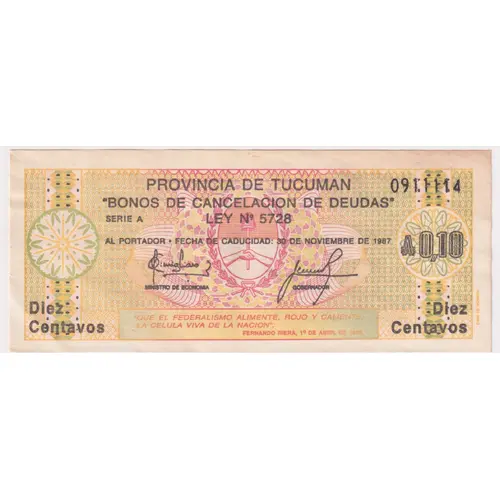 Obverse lettering PROVINCIA DE TUCUMAN `BONOS DE CANCELACION DE DEUDAS` SERIE A LEY No 5728 AL PORTADOR . FECHA DE CADUCIDAD: 30 DE NOVIEMBRE DE 1987 `QUE EL FEDERALISMO ALIMENTE, ROJO Y CALIENTE, LA CELULA VIVA DE LA NACION`, FERNANDO RIERA, 1° de ABRIL DE 1985