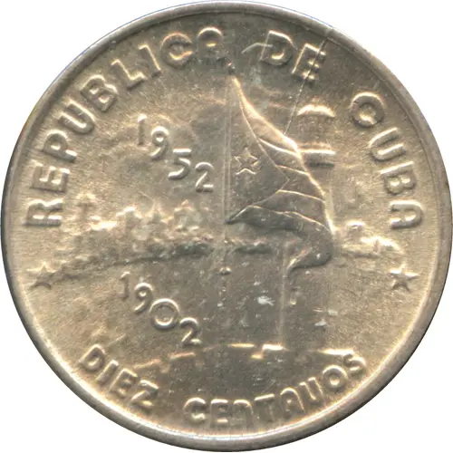 | Obverse lettering | REPUBLICA DE CUBA 1952 1902 DIEZ CENTAVOS (Translation: Republic of Cuba 1952 1902 Ten Cents) |