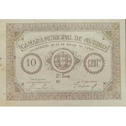 | Obverse lettering | CAMARA MUNICIPAL DE AVEIRO DELIBERAÇÃO DE 12 DE MAIO DE 1921. 10 cent.ºs 2a Série (Translation: Aveiro City Council Deliberation of May 12, 1921. 10 cents 2nd Series) |