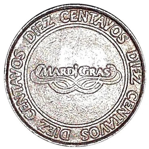 Circle accompanying the edge of the piece, with the caption: MARDIGRAS - MARDIGRAS - MARDIGRAS - MARDIGRAS -. In the center the value, read from top to bottom, 10 CENTAVOS. |