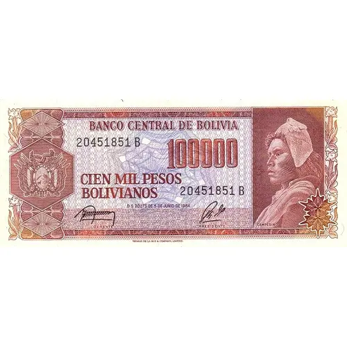 | Obverse lettering | BANCO CENTRAL DE BOLIVIA 100000 CIEN MIL PESOS BOLIVIANOS D. S. 20273 DE 5 DE JUNIO DE 1984 CAMPESINO (Translation: Central Bank of Bolivia 100,000 One hundred thousand Pesos Bolivianos D. S. (Supreme Decree) 20273 of June 5th., 1984 Farmer) |